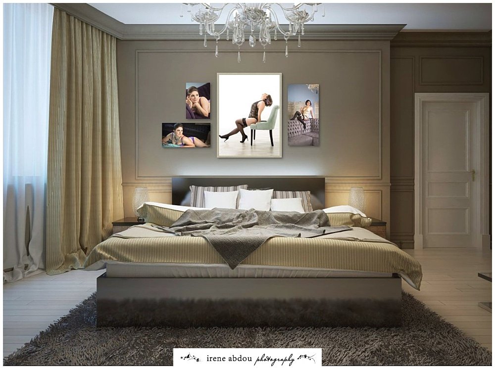 Yet, we had an absolutely amazing boudoir photography session at D.’s home in Gaithersburg, Maryland, featuring a hot pink and aqua outfit, a beautiful stone-studded, ornamental room divider that we used as a backdrop for some of her boudoir photos, a candle-lit fireplace, a piano, and a sheepskin rug. At D.’s photo reveal / boudoir photography ordering appointment, we planned a 4-piece canvas love grouping to go over their bed. (Funny enough, when D's husband received his boudoir photography gift, he decided to hang the love grouping in his home office instead.)